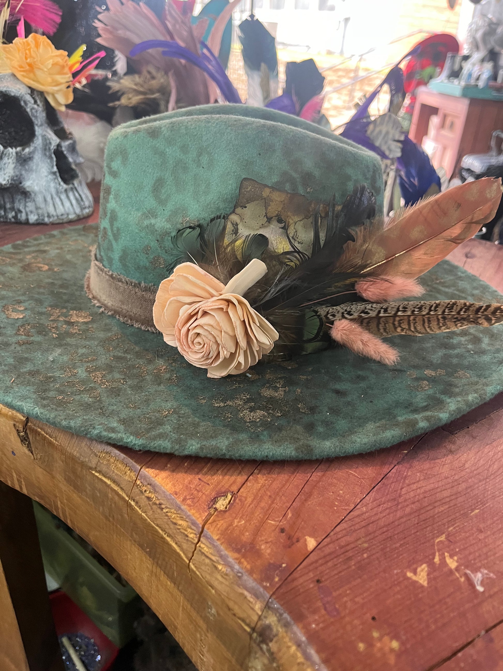 - Detachable hat fascinator with rose, burned card and natural feathers.